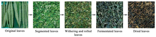 Then, the rolled lotus leaves were spread evenly on the well-ventilated fermentation frame (Kunshan Yongwang Plastic Products Co., Ltd., Suzhou, Jiangsu Province, China). The relative humidity was maintained at 90%, and the lotus leaves were fermented at a temperature of 35 °C. For sequencing, samples were taken during fermentation at intervals of 0, 3, 6, 12, and 24 h. Then, the samples were immediately frozen in liquid nitrogen (Nanjing Jindongsheng Trading Co., Ltd., Nanjing, Jiangsu Province, China) and stored at −80 °C for further analysis. For black tea making, fermented lotus leaves were further dried at 115 °C for 15 min to terminate fermentation via a tea dryer (Quanzhou Yike Machinery Co., Ltd., Quanzhou, Fujian Province, China). Then, the samples were further dried at 95 °C for about an hour. Photographs of lotus black tea at different stages was shown in Figure 1.