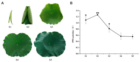 PPO activities at different developmental stages of lotus leaves. (A) Leaf developmental stages from S1 to S5. (B) Chart of PPO activities. The asterisk indicates a significant difference (single asterisk, p < 0.05; double asterisks, p < 0.01).