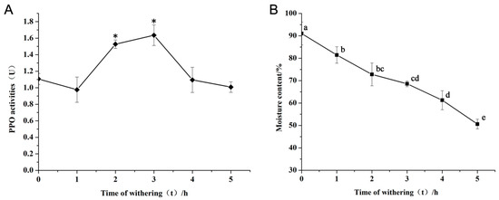 Parameters of withering leave. (A) PPO activities at different withering times for lotus leaves. (B) Moisture content at different withering times of lotus leaves. The asterisk indicates a significant difference (single asterisk, p < 0.05; different small letters in the same column indicate a significant difference at p < 0.05 level).