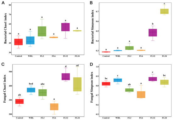 Microbial alpha diversity. Changes in the Chao1 and Simpson indexes of bacterial (A,B) and fungal (C,D) communities during the fermentation process of lotus leaves (different small letters in the same column indicate a significant difference at p < 0.05 level). WRL, withering and rolled leaves; FL3, leaves fermented for 3 h; FL6, leaves fermented for 6 h; FL12, leaves fermented for 12 h; FL24, leaves fermented for 24 h.
