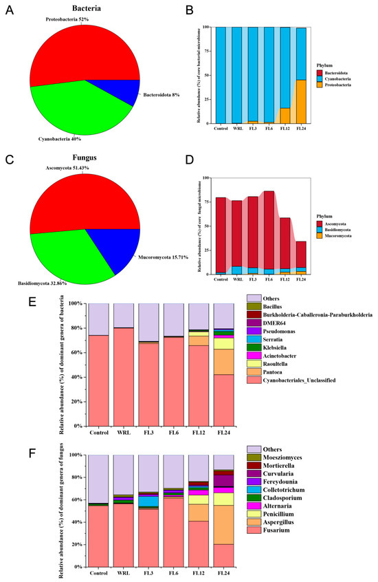 Microbial species composition. Community structure components of dominant species during the fermentation process of lotus leaves. Percentage and relative abundance (%) of the phyla in the core microbiome of bacteria (A,B) and fungus (C,D). Microbial taxonomic compositions showing the microbial successions at the genus level: (E) bacteria and (F) fungus. The results showed the top10 species, and the other species were classified into “Others”. WRL, withering and rolled leaves; FL3, leaves fermented for 3 h; FL6, leaves fermented for 6 h; FL12, leaves fermented for 12 h; FL24, leaves fermented for 24 h.