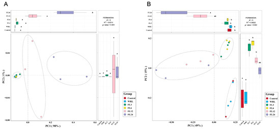 PCoA analysis with tests of microbial communities in samples during the fermentation process of lotus leaves: bacterial (A) and fungal (B). Based on the Bray-Curtis distance of the samples, the horizontal axis represents one principal component, and the vertical axis represents another principal component. The percentages indicate the contribution of the principal components to the differences among the samples. The samples are classified using dashed circles, and vertical/horizontal dashed lines represent the zero axes (different small letters in the same column indicate a significant difference at p < 0.05 level). WRL, withering and rolled leaves; FL3, leaves fermented for 3 h; FL6, leaves fermented for 6 h; FL12, leaves fermented for 12 h; FL24, leaves fermented for 24 h.