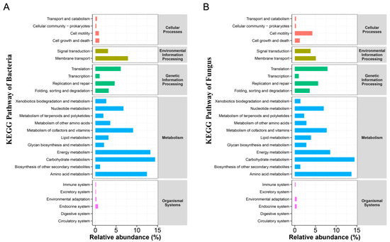 Prediction of the microbial function during the fermentation process of lotus leaves using PICRUSt (Phylogenetic Investigation of Communities by Reconstruction of Unobserved States): bacterial (A) and fungal (B). Average relative abundance of Kyoto Encyclopedia of Genes and Genomes (KEGG) pathway annotations at levels 1 and 2 for all lotus leaves samples. The colors of the bars represent different classification levels of Level 1, with annotations provided on the right side. The length of the bars represents the average relative abundance of the Level 2.