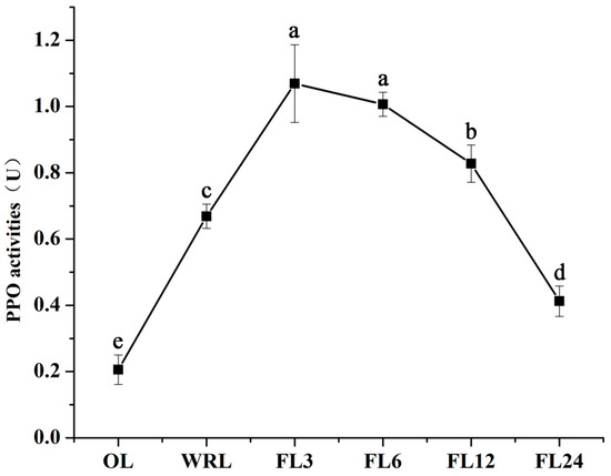 PPO activities during processing (different small letters in the same column indicate a significant difference at p < 0.05 level). OL, original leaves; WRL, withering and rolled leaves; FL3, leaves fermented for 3 h; FL6, leaves fermented for 6 h; FL12, leaves fermented for 12 h; FL24, leaves fermented for 24 h.
