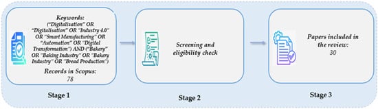 Figure 1 illustrates the steps undertaken in the literature review process, structured into three main stages. In Stage 1, a set of keywords related to digitalization, Industry 4.0, smart manufacturing, automation, and digital transformation in the bakery sector was used to retrieve relevant records from the Scopus database, identifying 78 potentially relevant studies. Stage 2 involved a screening and eligibility check, in which the retrieved papers were assessed based on predefined criteria. This process included reviewing abstracts, methodologies, and findings to exclude studies that did not meet the inclusion requirements. Finally, in Stage 3, 30 papers were selected for the final review, forming the foundation of the study and offering valuable insights into the digital transformation of the bakery industry.