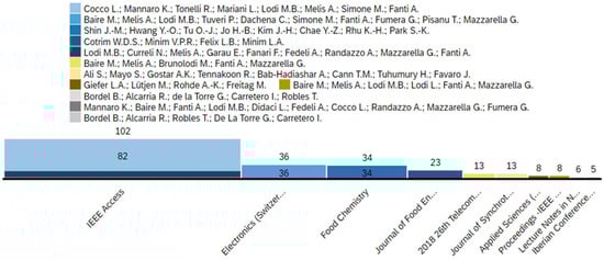 Figure 4 shows the distribution of citation numbers in various academic and research sources and illuminates the awareness and effects of these publications. In particular, IEEE Access is the most influential source and collects 102 citations. This high number of citations underlines its significant role in the spread of research to a wide and diverse audience and stores several areas of study. Other leading scientific sources are electronics (Switzerland), food chemistry, and the Journal of Food Engineering, each of which has also shown significant influence in their respective areas. These sources underline the multidisciplinary character of research and reflect articles from engineering, chemical, and food science disciplines. The citation trends offer valuable insights into the relevance and reach of the published studies within the academic community and beyond.