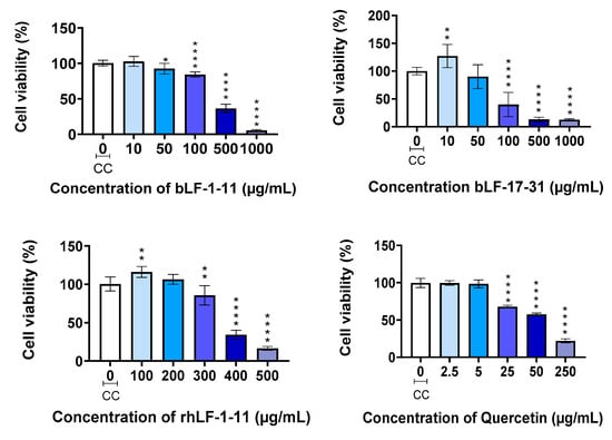 Based on their antioxidant activities, the most promising peptides, bLF-1-11, bLF-17-31, and rhLF-1-11, were selected for further evaluation of both antioxidant and anti-inflammatory properties in cellulo. Prior to advancing with these studies, the non-cytotoxic dosages of the peptides towards RAW 264.7 macrophage-like cell line were evaluated. To this end, cell viability determination by the MTT assay was employed, and quercetin was included as a control (Figure 1).