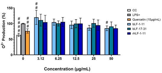 As shown in Figure 2, control cells (CC), i.e., non-stimulated by LPS, showed low production of superoxide, whereas this radical anion was significantly produced in LPS-stimulated cells (LPS +). Interestingly, treatment of LPS-stimulated macrophages with the test peptides apparently exerts a dose-dependent response, suggesting the peptides’ ability to inhibit the production of O2•− at high concentrations. This is in line with the IC50 values estimated namely, 133 ± 13 µg/mL, 291 ± 36 µg/mL, and 183 ± 25 µg/mL for bLF-1-11, bLF-17-31 and rhLF-1-11, respectively. Considering the cytotoxic concentrations for these peptides (see Section 3.1), peptide rhLF-1-11, derived from the recombinant human LF protein, could significantly inhibit O2•− production in LPS-stimulated cells at a concentration much below its cytotoxic concentration. The positive control quercetin, at 10 mg/mL, reduced O2•− production by about 25% compared to the control (LPS +).