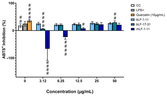 The results for the ABTS•+ Radical-Cation Scavenging Assayis presented in Figure 3 and the TAS of the LF-derived peptides is presented in Figure 4. Consistent results could only be obtained for peptide bLF-17-31 (Figure 3), which showed scavenging activity with an IC50 of 105.31 ± 18.92 µg/mL.. Both this fact and the unexpected observation that LPS-activated (LPS +) cells scavenged ABTS•+ more effectively than non-activated ones (CC) remain to be elucidated.