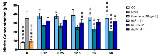 As such, we evaluated the influence of the LF-derived peptides under study on NO generation in LPS-stimulated RAW 264.7 cells by the Griess method. LPS-activated cells (LPS +) showed much higher levels of NO than non-activated ones (CC), whereas quercetin was able to significantly reduce NO levels in LPS-activated cells at 10 mg/mL (Figure 4). The test peptides showed a much lower ability to inhibit NO formation, although all of them seemingly exert some level of inhibition. As seen in Table 4 peptide bLF-17-31 showed the lowest IC50 with 44.07 µg/mL.