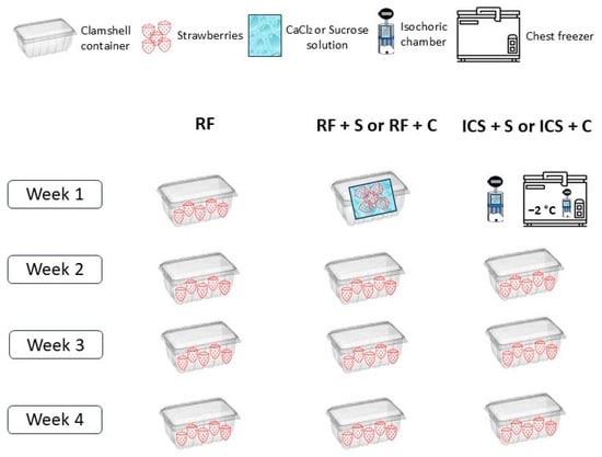 The following five different methods were used to preserve fresh strawberries for up to 4 weeks: refrigeration without impregnation solution at 4 °C for 4 weeks (RF); refrigeration in sucrose solution at 4 °C for one week and refrigeration without solution at 4 °C for 3 additional weeks (RF + S); refrigeration in sucrose + CaCl2 + ascorbic acid (AA) solution at 4 °C for one week and refrigeration without solution at 4 °C for 3 additional weeks (RF + C); isochoric cold storage in sucrose solution at −2 °C for one week and refrigeration without solution at 4 °C for 3 additional weeks (ICS + S), and isochoric cold storage in sucrose + CaCl2 + AA solution at −2 °C for one week and refrigeration without solution at 4 °C for 3 additional weeks (ICS + C).