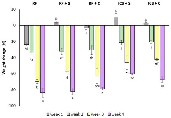 Weight change (g) of preserved strawberries. RF: refrigeration, RF + S: refrigeration with sucrose solution, RF + C: refrigeration with CaCl2 + ascorbic acid (AA) solution, ICS + S: isochoric cold storage with sucrose solution, ICS + C: isochoric cold storage with sucrose + CaCl2 + AA solution. Values followed by the same letter (a–k) are not statistically different at p < 0.05.