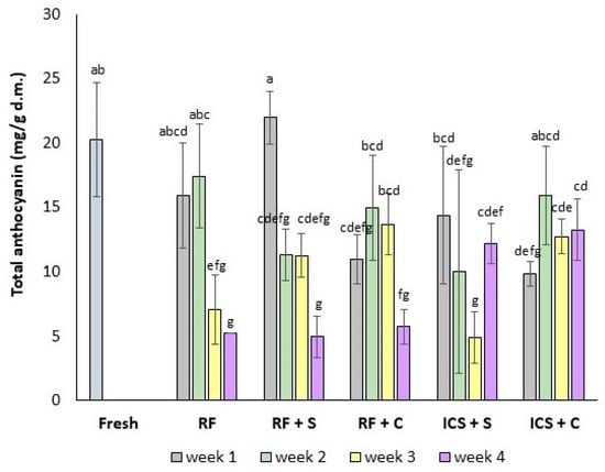 Total anthocyanin content (mg/g d.m.) in fresh and preserved strawberries. RF: refrigeration, RF + S: refrigeration with sucrose solution, RF + C: refrigeration with CaCl2 + ascorbic acid (AA) solution, ICS + S: isochoric cold storage with sucrose solution, ICS + C: isochoric cold storage with sucrose + CaCl2 + AA solution. Values followed by the same letter (a–g) are not statistically different at p < 0.05.