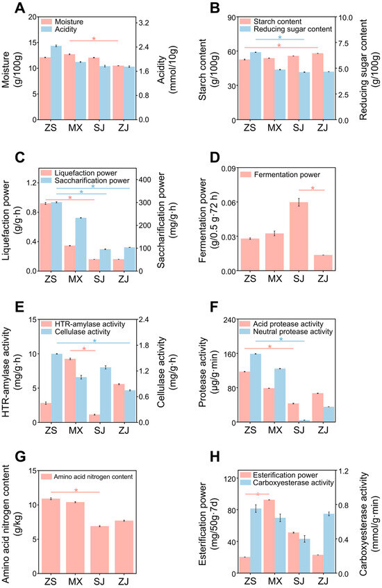 Physicochemical properties and enzymatic activities of four high-temperature Daqu samples (ZS, MX, SJ, and ZJ). (A) Moisture and acidity, (B) starch content and reducing sugar content, (C) liquefaction power and saccharification power, (D) fermentation power, (E) HTR-amylase activity and cellulase activity, (F) Neutral and acid protease activity, (G) amino acid nitrogen content, and (H) esterification power and carboxyesterase activity. Significant differences between samples for each index were analyzed using Kruskal–Wallis rank sum test. Samples with significant differences are indicated by asterisk (*) (p < 0.05).