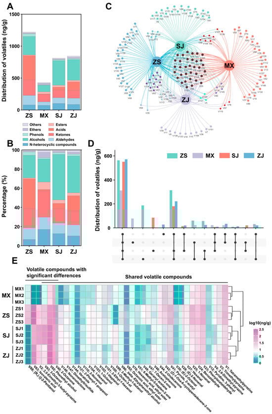 A comparison of the volatile compounds of the four high-temperature Daqu samples based on the results of HS−SPME−GC/MS. (A) Variations in the category and number of volatiles, (B) variations in the relative content of each category, (C) shared and unique volatile compounds presented by Venn networks, (D) relative abundances of shared and unique volatile compounds shown by Upset plot, and (E) contents of the top 32 volatile compounds in abundance ranking and volatile compounds with significant differences in the four high-temperature Daqu samples.