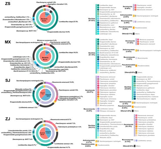 The prokaryotes in the four samples were mainly composed of Bacillota at the phylum level, accounting for 90.9–95.4% of the total prokaryotes, followed by Actinomycetota (3.0–7.5%) and Pseudomonadota (1.0–1.2%). At the species level, seventeen dominant bacteria (relative abundance > 1%) were found in the four samples, three of these dominant bacteria, namely, Kroppenstedtia eburnean, Desmospora sp. 8437, and Kroppenstedtia guangzhouensis, were shared among the four samples. MX had the largest number of dominant bacterial species (15) and the most unique dominant fungi (6), which might be the reason behind its lowest Simpson index and highest Shannon index (Figure S3). Different from MX, ZS and ZJ had higher Simpson indices and lower Shannon indices, indicating that a relatively small number of bacteria dominated their bacterial communities. This finding explained why ZS and ZJ had a similar proportion of bacterial abundance to MX, but the number of their dominant bacterial species (8) was far less than that of MX. Eukaryotes were mainly composed of Ascomycota at the phylum level, accounting for 48.8–88.84% of the total eukaryotes, followed by Mucoromycota (9.9–17.6%). At the species level, six dominant fungi were found, including Paecilomyces variotii that was shared among the four samples. According to the α-diversity indices, SJ had the highest eukaryotic richness (ACE index and Chao index) and diversity (Shannon index), probably because it had the largest proportion of relative abundance of eukaryotes. Meanwhile, there was no significant difference in the Simpson index of eukaryotes, indicating that the dominance degrees of the dominant fungi in the four samples were similar.