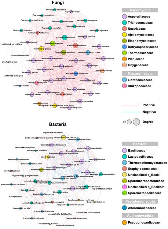 Co-occurrence networks of bacteria and fungi in high-temperature Daqu from Southern Sichuan–Northern Guizhou region based on Spearman correlation coefficients. Nodes represent individual microbial species. Red and blue edges represent significantly positive and negative correlations, respectively (Spearman’s r > 0.75 or < −0.75, p < 0.05).