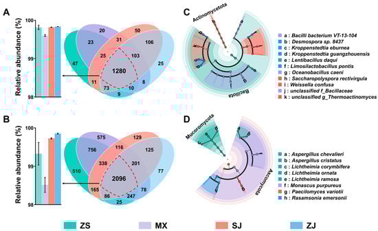 Venn and bar diagrams showing number of shared and unique (A) bacterial and (B) fungal species and corresponding relative abundance of shared microbial community. Linear discriminant analysis effect size (LEfSe) of bacterial communities (C) and fungal communities (D) among different Daqu samples (LDA score ≥ 4).