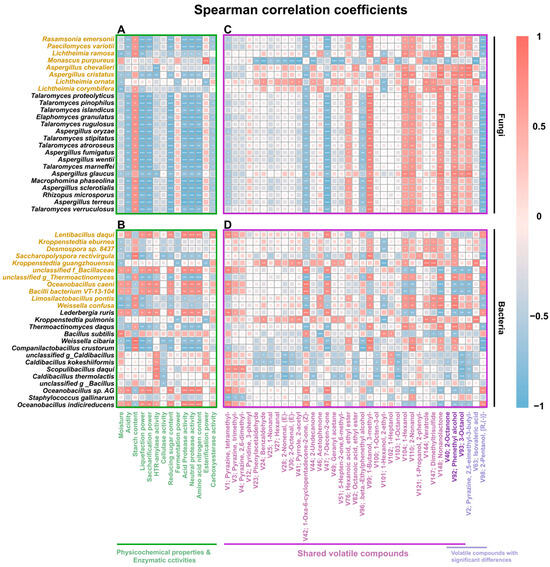 The correlation of 50 predominant microbial species (including the 20 top fungal species (A,C) and the 20 top bacterial species (B,D)) with physicochemical properties, enzymatic activities, and volatile compounds in high-temperature Daqu from the Southern Sichuan–Northern Guizhou region. Here, * indicates a significant correlation at the 0.05 level, ** at the 0.01 level, and *** at the 0.001 level. The microorganisms named with the gold color are biomarkers. The volatile compounds include 34 shared volatile compounds ranked by abundance and 6 volatile compounds with significant differences.
