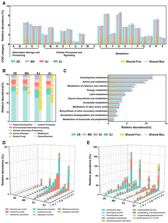 Functional annotation of Daqu microbiota genes by the COG (A) and KEGG (B,C) databases. The specific function description of each COG category is shown in Table S4. The functional annotations of fungal biomarkers (D) and bacterial biomarkers (E) in different Daqu samples in the KEGG database show the diverse functional contributions of various microorganisms to high-temperature Daqu. The specific functional description of each KEGG code is shown in Table S5.