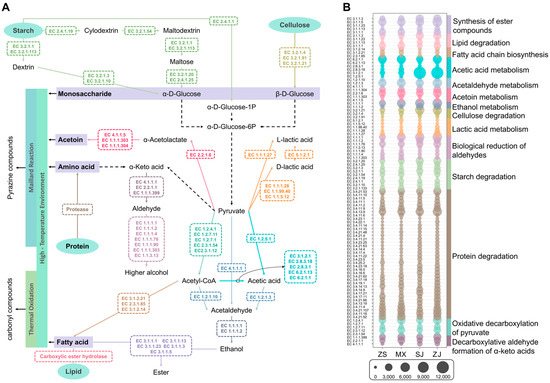 Starch and cellulose are degraded into reducing sugars under the action of above functional enzymes and then produce pyruvate via the glycolytic pathway. In this study, 21 functional enzymes were predicted and found to be involved in pyruvate metabolism to lactic acid, acetic acid, acetaldehyde, and ethanol. Alcohol dehydrogenase (EC 1.1.1.1) exhibited high abundance across all the Daqu samples and may be crucial for the fermentation power of high-temperature Daqu [9]. Pyruvate is also an important precursor for various alcohols, pyrazines, acids, esters, aldehydes, and ketones. In this study, four enzymes were predicted to be involved in acetoin metabolism, which can help convert pyruvate into pyrazine [30]. Moreover, the four Daqu samples from the Sichuan–Guizhou region all contained similar abundances of acetoin-metabolizing enzymes, which can ensure pyrazine synthesis. Pyruvate can be converted into α-keto acids through transaminases, pyruvate carboxylase, and oxidative decarboxylation reactions and then into higher alcohols through the decarboxylation and aldehyde group formation of α-keto acids and the biological reduction in aldehydes [14]. Seven aldehyde reductases were predicted. In the four Daqu samples, the abundance of alcohol dehydrogenase and alcohol dehydrogenase (NADP+) (EC 1.1.1.2) was positively correlated with the level of phenethyl alcohol. Similarly, the abundance of (R,R)-butanediol dehydrogenase (EC 1.1.1.4) was positively correlated with the level of 3-octanol. Meanwhile, three enzymes were predicted to convert acetyl-CoA (obtained from the oxidative decarboxylation of pyruvate) into fatty acids, providing substrates for esterification and fatty acid oxidation. In the four Daqu samples, the abundance of the fatty acid synthase system (EC 2.3.1.85) was positively correlated with the level of 7-decen-2-one and (Z)-1-oxa-6-cyclopentadecene-2-one [9]. In addition, 38 proteases were predicted, with Xaa-Pro dipeptidase (EC 3.4.13.9), endopeptidase Clp (EC 3.4.21.92), methionyl aminopeptidase (EC 3.4.11.18), peptidase Do (EC 3.4.21.107), and endopeptidase La (EC 3.4.21.53) being the dominant ones. These proteases generate free amino groups that participate in the Maillard reactions with carbonyl compounds, contributing to pyrazine formation in high-temperature Daqu [26]. Four carboxylic ester hydrolases, namely, carboxylesterase (EC 3.1.1.1), sterol esterase (EC 3.1.1.13), acylglycerol lipase (EC 3.1.1.23), and triacylglycerol lipase (EC 3.1.1.3), were predicted and found to accelerate the synthesis of aldehydes, ketones, and esters in high-temperature Daqu via lipid degradation.