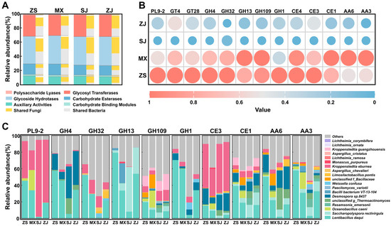 Although the saccharification ability of high-temperature Daqu is significantly lower than that of low-, medium-, and medium–high-temperature Daqu due to production processes and requirements [11], the abundance of its functional genes involved in carbohydrate metabolism is still the highest. Therefore, we explored the commonalities and differences in the carbohydrate utilization ability among the four Daqu samples using the CAZy database to further analyze the relationship between amylases and starch degradation capacity in high-temperature Daqu from the Southern Sichuan–Northern Guizhou region. At the class level of the CAZy database, six functional categories were annotated. Among them, glycoside hydrotases (39.00–41.15%) and glycosyl transferases (29.00–30.56%) dominated in all the samples, which was similar to the research results of Yang [31]. Glycoside hydrotases are an important group of enzymes that hydrolyze glycosidic bonds, including the enzymes associated with starch liquefaction, glycation, and cellulose degradation [14]. As is consistent with the KEGG database annotations, the CAZy database analysis indicated that the shared microorganisms primarily encode the functional genes in each category (Figure 9A).