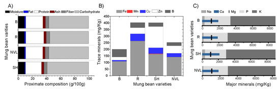 Ethiopian mung bean varieties flour (A) proximate composition, (B) trace minerals, and (C) major minerals composition. SH, R, B, and NVL are the mung bean variety’s name codes representing Shoarobit, Rasa, Baroda, and NVL-1, respectively.
