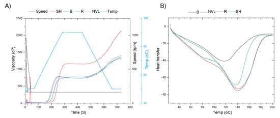 Ethiopian mung bean varieties’ (A) pasting properties and (B) differential scanning calory meter values. The abbreviations AA, SH, R, B, and NVL are used to represent ascorbic acid, and the Shoarobit, Rasa, Baroda, and NVL-1 varieties, respectively.