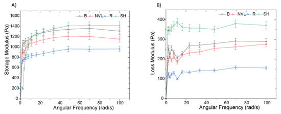Rheological properties of mung bean varieties in Ethiopia during frequency sweep at 25 °C and 0–100 rad/sec are expressed as (A) storage modulus and (B) loss of modulus. The abbreviations SH, R, B, and NVL represent the Shoarobit, Rasa, Baroda, and NVL-1 varieties, respectively.