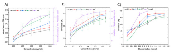 Ethiopian mung bean varieties’ antioxidant activities: (A) FRAP, (B) DPPH, and (C) ABTS values. The abbreviations AA, SH, R, B, and NVL represent ascorbic acid, and the Shoarobit, Rasa, Baroda, and NVL-1 varieties, respectively.