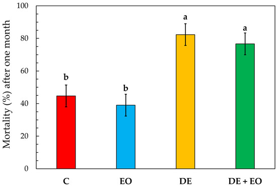 Mortality (%) of Sitophilus oryzae adults in the different treatments applied to soft wheat (C = control; EO = 130 µL of Ocimum basilicum essential oil/kg wheat; DE = 130 mg of diatomaceous earth/kg wheat; DE + EO = 65 mg of DE/kg wheat + 65 µL of O. basilicum EO/kg wheat) after one month. Bars represent standard errors (n = 3). Different letters indicate significant differences between treatments (Tukey’s HSD p < 0.05).