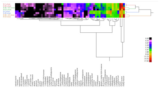 The HCA (Figure 2) and the PCA of VOCs (Figure S1) confirmed these observations, showing whole and sliced samples clustered separated from each other. Within each group, samples treated with the EO grouped separately from the non-treated ones.