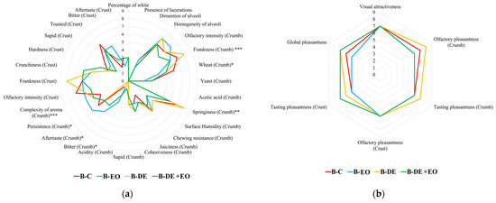 Sensory profile of bread: (a) Quantitative parameters; (b) Hedonic parameters. Significance level: *** = p < 0.001; ** = p < 0.01; * = p < 0.05; without asterisk = not significant (p ≥ 0.05).