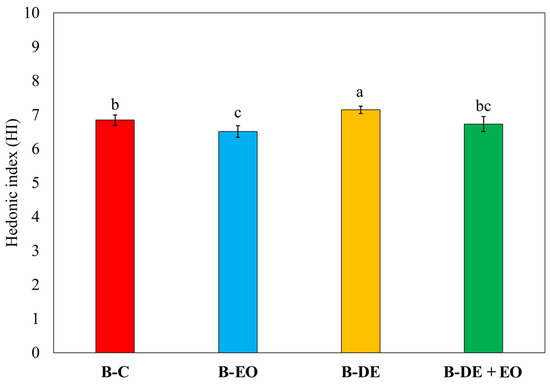 Hedonic index (HI). Bars represent standard errors (n = 8). Different letters indicate significant differences between treatments (Tukey’s HSD p < 0.05).