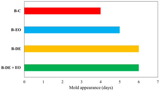As shown in Figure 5, minor differences were found in the shelf life of the various samples compared to the control (B-C); however, treatments with DE and DE + EO extended the shelf life of the product by one day compared to the other sample. The anti-mold mechanism of essential oil in bread has been extensively studied [74,75,76]. Although there are no specific studies addressing the effect of DE on bread shelf life, some papers suggest that DE treatment may influence water absorption in flour [71]. This could have affected water availability for mold growth, however, further studies should be carried out to better understand the role of DE in bread shelf-life definition.