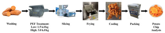 Sweet potato kettle chips were prepared by rinsing the tubers, PEF treating, slicing to 1.7 mm thickness, frying at 130 °C, cooling, and packing in a nitrogen environment until they were analyzed. Created with BioRender.com URL (accessed on 16 July 2024) [38].