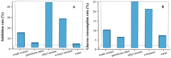 The hypoglycemic activity of different fractions of the crude extract of G. divaricata. α-glucosidase inhibition activities (A); effect on HepG2 glucose uptake (B).