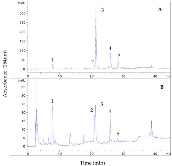 HPLC chromatograms of the EtOAc (A) and BuOH (B) fractions of the G. divaricata extract.