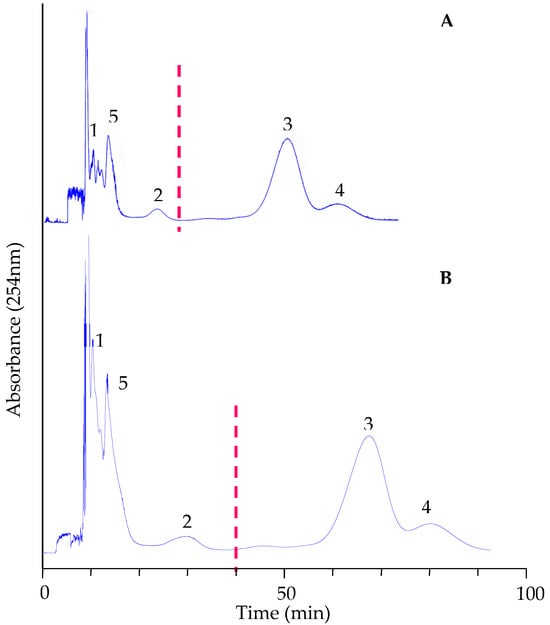 Analytical (A) and preparative (B) CCC chromatograms of the ethyl acetate fraction of G. divaricata extract under the optimized conditions. Mobile phase: gradient from the lower phase of hexane–MtBE–methanol–0.1% TFA water (0:10:1:9) to (2:8:2:8); flow rate: 1.5 mL/min (A) and 6.0 mL/min (B); revolution speed: 1600 rpm; column temperature: 30 °C; detection: 254 nm; sample: 20 mg/1 mL (A) and 120 mg/6 mL (B). The peak 1–5 are corresponding to the peak 1–5 in Figure 2.