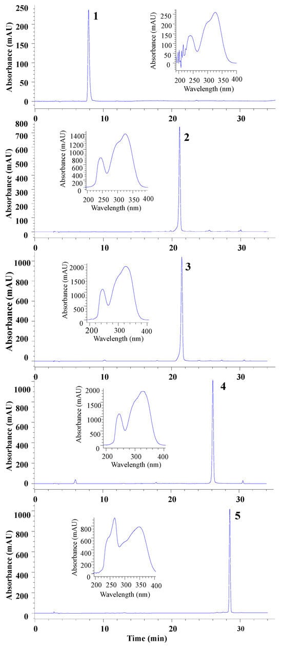 As shown in Figure 3, compounds in peaks 1 and 5 were still not well resolved from the others, so they were subjected to further purification using the solvent system ethyl acetate–0.1% TFA water (1:1). Finally, five pure compounds were obtained from a 250 mg ethyl acetate extract of G. divaricata: 6.5 mg of compound 1 (98.54% HPLC purity), 3.5 mg of compound 2 (96.62% purity), 38.6 mg of compound 3 (97.14% purity), 7.3 mg of compound 4 (96.55% purity), and 24.4 mg of compound 5 (98.51% purity). Their individual UV spectra were identical to those in the initial sample. Figure 4 shows the purity analysis of these compounds.