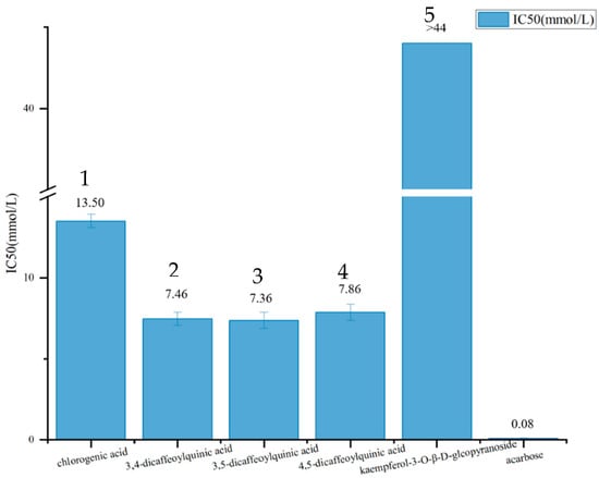 The five isolated compounds were dissolved in DMSO at different concentration, and their IC50 values for α-glucosidase inhibition were measured, as shown in Figure 5. Compounds 2–4 exhibit significantly higher inhibitory activities, followed by compound 1, while compound 5 shows the lowest activity.