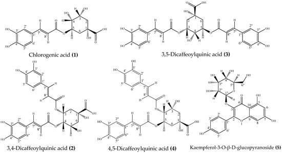The structure identification of five compounds (1–5) was performed with ESI-MS, 1H NMR (600 MHz), and 13C NMR (150 MHz). Five compounds (1–5) were tentatively identified as chlorogenic acid (1), 3,4-dicaffeoylquinic acid (2), 3,5-dicaffeoylquinic acid (3), 4,5-dicaffeoylquinic acid (4), and kaempferol-3-O-β-D-glucopyranoside (5) by δ and J values analysis, and comparison with references [,,]. ESI-MS measurements supported this identification, exhibiting [M-H]- ions at m/z 353.2 (1, C16H18O9), m/z 515.2 (2, 3, 4, C25H24O12), and m/z 447.2 (5, C21H20O11). The chemical structures of the five identified compounds were illustrated in Figure 6. The NMR data for each compound are provided below, with the spectra available in Figure S5. The assignments, especially for the three dicaffeoylquinic acid isomers, can be further confirmed using 2D-NMR analysis.