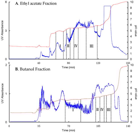PZRCCC of the ethyl acetate and butanol fractions of G. divaricate extract. Solvent system: MtBE: n-butanol: acetonitrile: water (1:3:1:5, v/v), TFA (10 mM, pH = 2) as the retainer in the upper stationary phase and NH4 OH (10 mM, pH = 10.0) as the eluter in the lower mobile phase; flow rate: 2.0 mL/min; revolution speed: 1600 rpm; column temperature: 30 °C; detection: 254 nm; sample amount: 1 g.