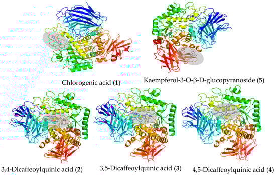 The five isolated compounds were evaluated for their inhibitory effects on α-glucosidase through molecular docking. Higher docking scores (binding energy values) indicate more stable and rational interactions between the ligand and the protein. As illustrated in Figure 8, the three dicaffeoylquinic acids (2, 3, 4) were stably docked into the active site of α-glucosidase, in the same pocket where acarbose binds, as reported in the literature []. They combined with the target protein through amino acid residues similar to those of acarbose, which is notably different from the interaction of chlorogenic acid (1) and kaempferol-3-O-β-D-glucopyranoside (5), as seen in Table 2 and Figure S4. The differences in the interaction bonds between the specific molecules and the distinct amino acid residues of α-glucosidase resulted in varying inhibitory activities. This supports the α-glucosidase inhabitation assay results mentioned earlier.