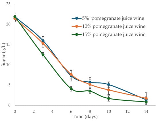 Evolution of sugar during the bottle fermentation of wines with varying pomegranate juice percentages (n = 2).
