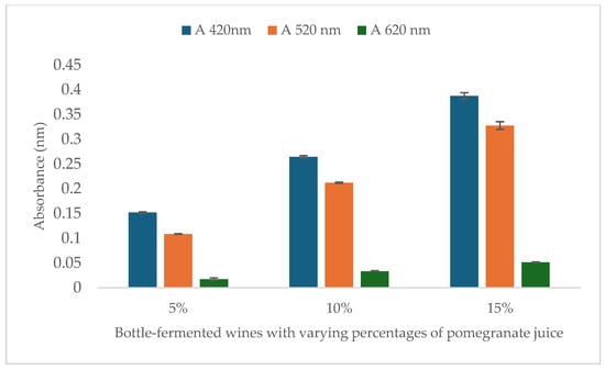 The results of the colour analysis are shown in Figure 2. As the percentage of added pomegranate juice increases in bottle-fermented wines (5%, 10%, and 15%), the colour intensity also increases, reflected by higher absorbance values at 420 nm, 520 nm, and 620 nm. The most notable changes are observed at 420 nm and 520 nm. The addition of pomegranate juice resulted in a proportional increase in colour intensity.