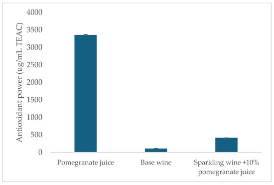 One of the factors that gives pomegranate juice its beneficial properties is its high content of polyphenols, which generally translates into a high antioxidant capacity. The antioxidant power value found in the pomegranate juice used in the present experiment was 3355 mg/L TEAC (Figure 3). Seeram et al. (2008) [41], comparing different drinks rich in polyphenols, found that pomegranate juice has by far the highest antioxidant power (10,412 mg/L in Trolox equivalents (TEAC)), followed by red wine (on average 4680 mg/L TEAC). Mousavinejad et al. (2009) [42] found similar values when analyzing the antioxidant power of eight different pomegranate juices, which ranged from 4655 to 10712 mg/L TEAC. Similarly, Fisher et al. (2011) [43] reported values between 5431 and 19122 mg/L TEAC. It appears that the antioxidant activity measured in the pomegranate juice used in the present paper is slightly lower than the literature data. This could be due to a loss of polyphenols caused by pasteurization, but it is still in line with the antioxidant power of red wines.