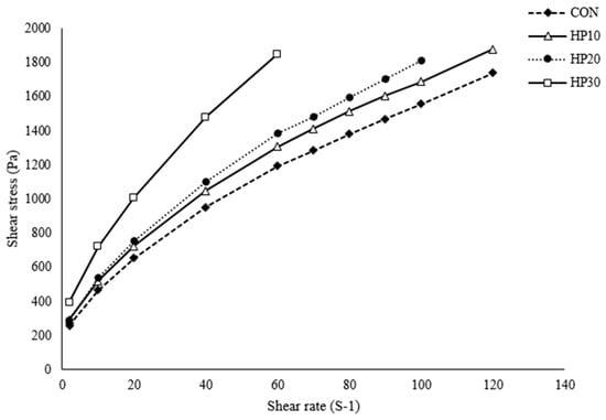 The shear stress of the muffin batter, as illustrated in Figure 1, demonstrates a clear increase with rising shear rate, exhibiting typical shear-thinning behavior. Batters fortified with higher levels of HPIs displayed significantly greater shear stress compared to the control (CON), with the curves steepening as HPI content increased, indicating that higher HPI content enhances the batter’s resistance to flow. The experimental data were accurately modeled using the Casson and Herschel–Bulkley equations (Table 4), with R2 values ranging from 0.995 to 0.999, confirming a strong fit. Yield stress values also increased with HPI content, suggesting that HPI strengthens the batter structure primarily through enhanced protein interactions and network formation. During batter formation, proteins in the HPI interact both with each other and with gluten from the wheat flour, forming a robust three-dimensional network [46]. This network effectively traps moisture and enhances the structural integrity of the batter, thereby increasing its resistance to deformation. Additionally, HPI’s high water-holding capacity allows it to absorb and retain moisture effectively; by binding more water, HPI reduces the availability of free water in the batter, which further increases viscosity and shear stress measurements. These findings are consistent with previous reports indicating that protein-rich doughs exhibit higher viscosity and yield stress [47]. Moreover, as HPI hydrates during mixing, it forms a gel-like structure that thickens the batter due to protein unfolding and interaction with water molecules.