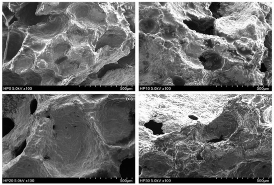 Microstructure analysis of vegan muffin crumbs. (a) CON, (b) HP10, (c) HP20, (d) HP30.