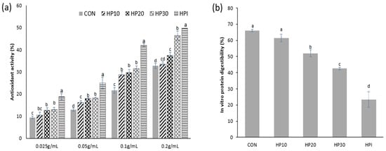 (a) ABTS radical activity (%) and (b) IVPD (%) of muffins. Different superscript letters (a–d) show significant differences (p < 0.05) within the column.